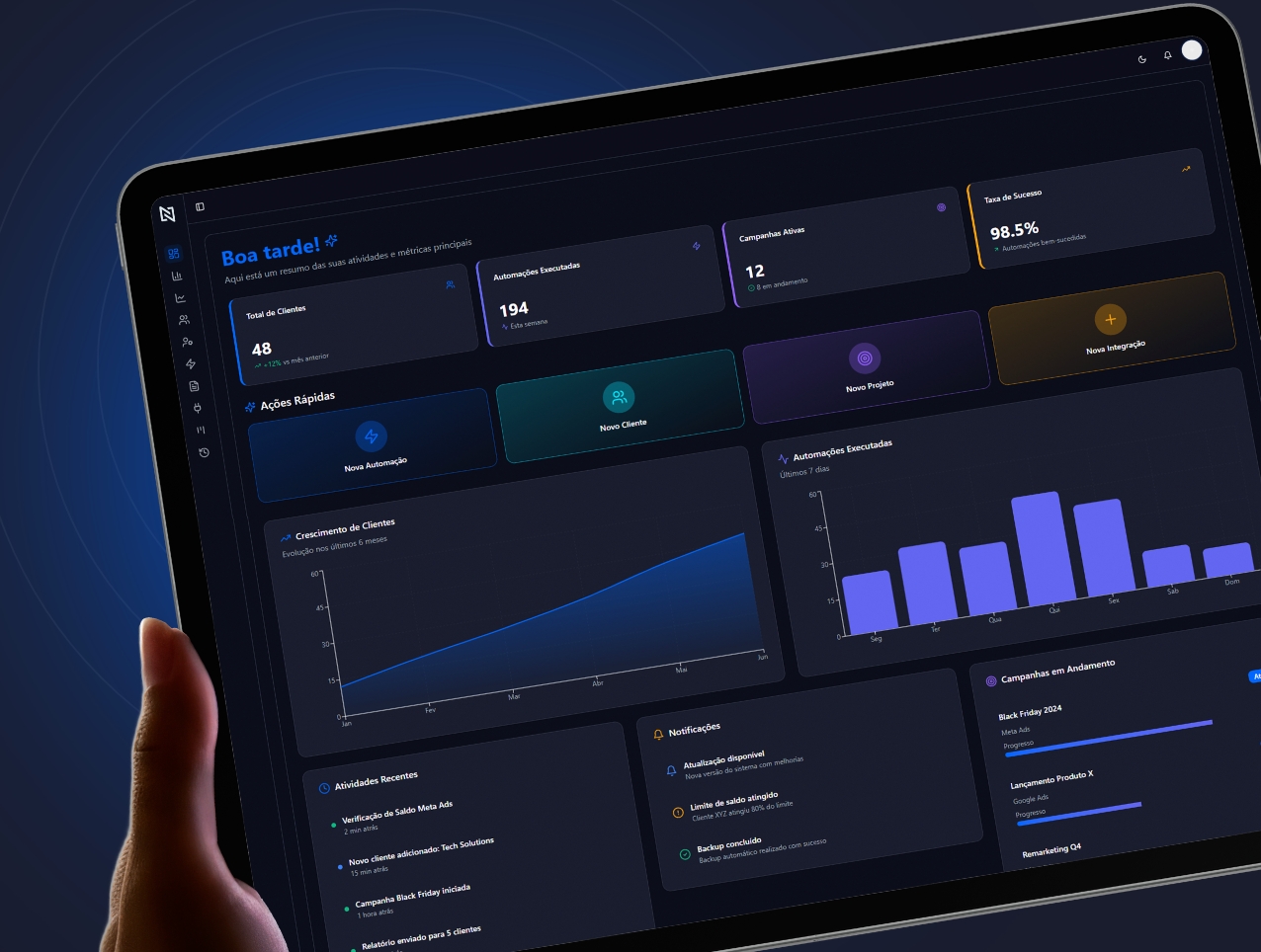 A NoBreakAds foi desenhada justamente para reduzir o número de plataformas que você acessa diariamente. Em vez de entrar no Google Ads, Meta Ads Manager, planilhas, Trello e WhatsApp separadamente, você centraliza tudo em um único painel.