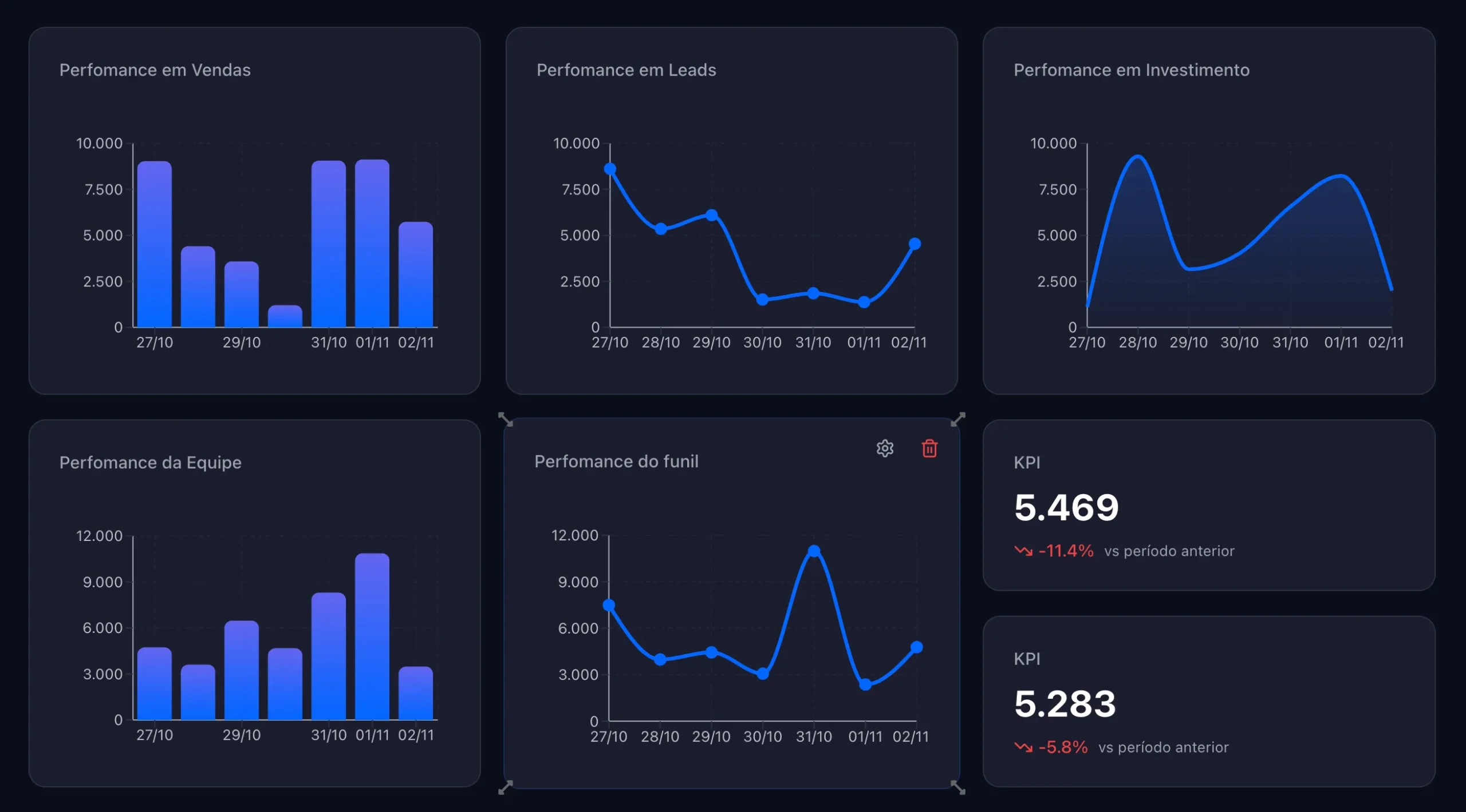 Arraste e solte widgets, escolha cores, métricas e layout que fazem sentido para seu negócio