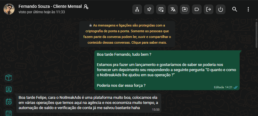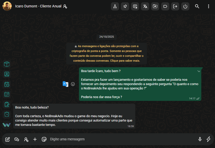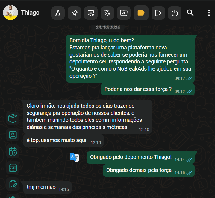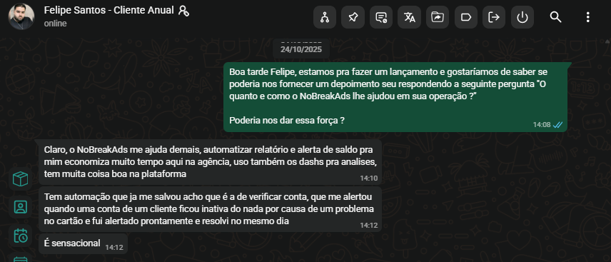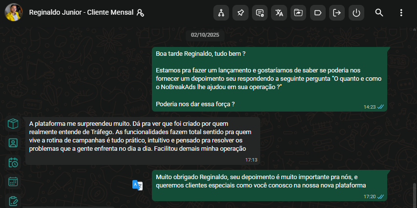 Nosso suporte é premium e extremamente rápido. A diretoria da NoBreakAds é brutalmente exigente com tempo de resposta e qualidade do atendimento. Não é protocolo superficial — é compromisso operacional.