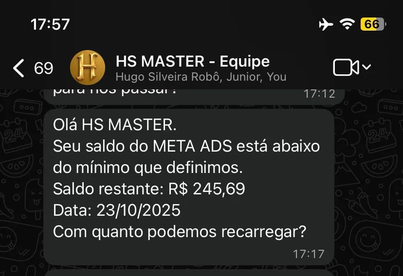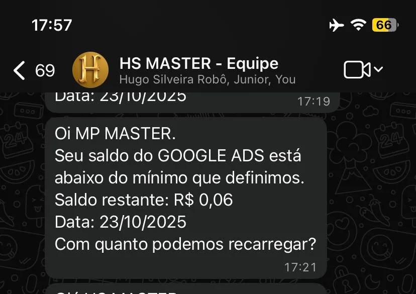 Nunca mais campanha parada por falta de saldo. A gente te cutuca antes. Aviso de saldo abaixo do mÃínimo no Google Ads, com pergunta de recarga.